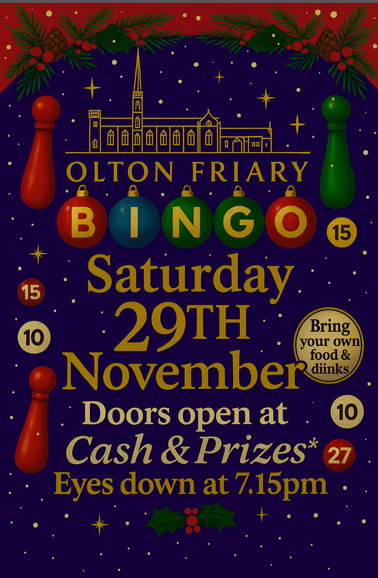 The next Bingo night will be on Saturday 29th November, in the Parish Hall. Doors open at 7pm. Come along and join the fun!