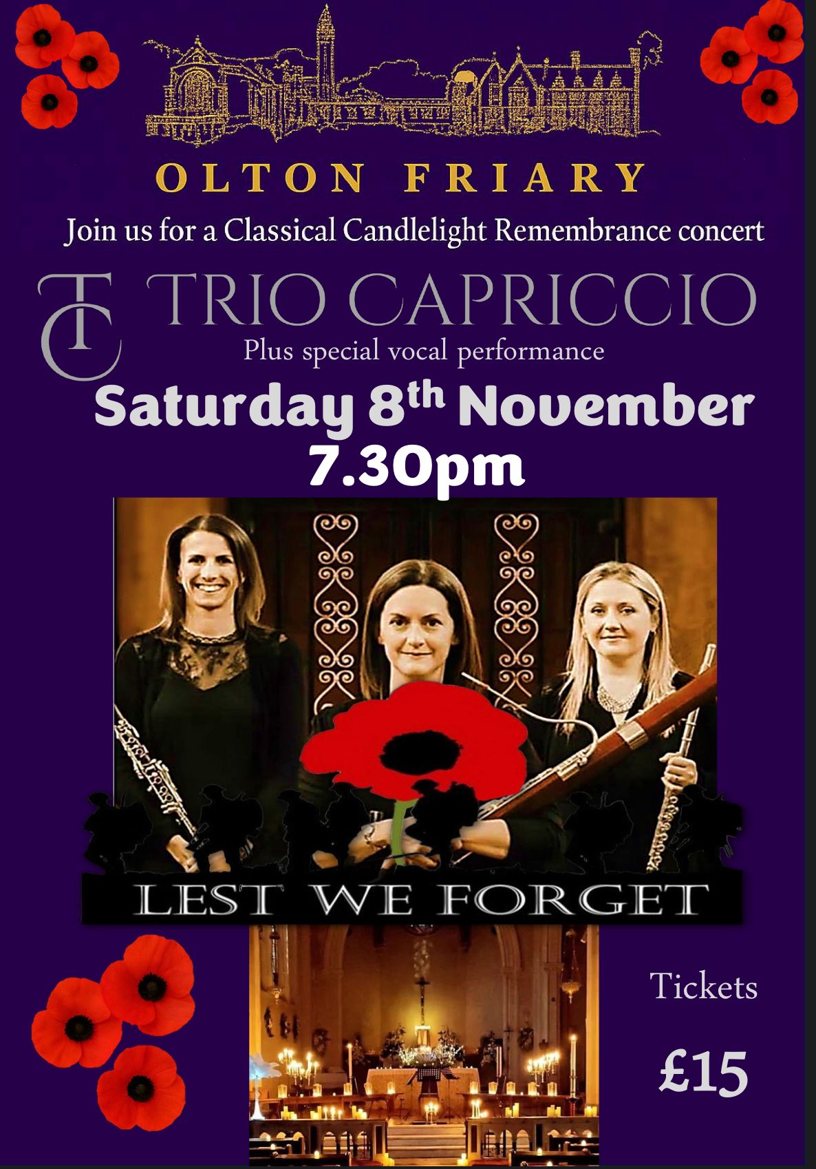 Join us at Olton Friary for a beautiful evening of fabulous music in candlelight, on a theme of Remembrance. Tickets can be bought after Mass on Sunday or requested through the Parish Office
