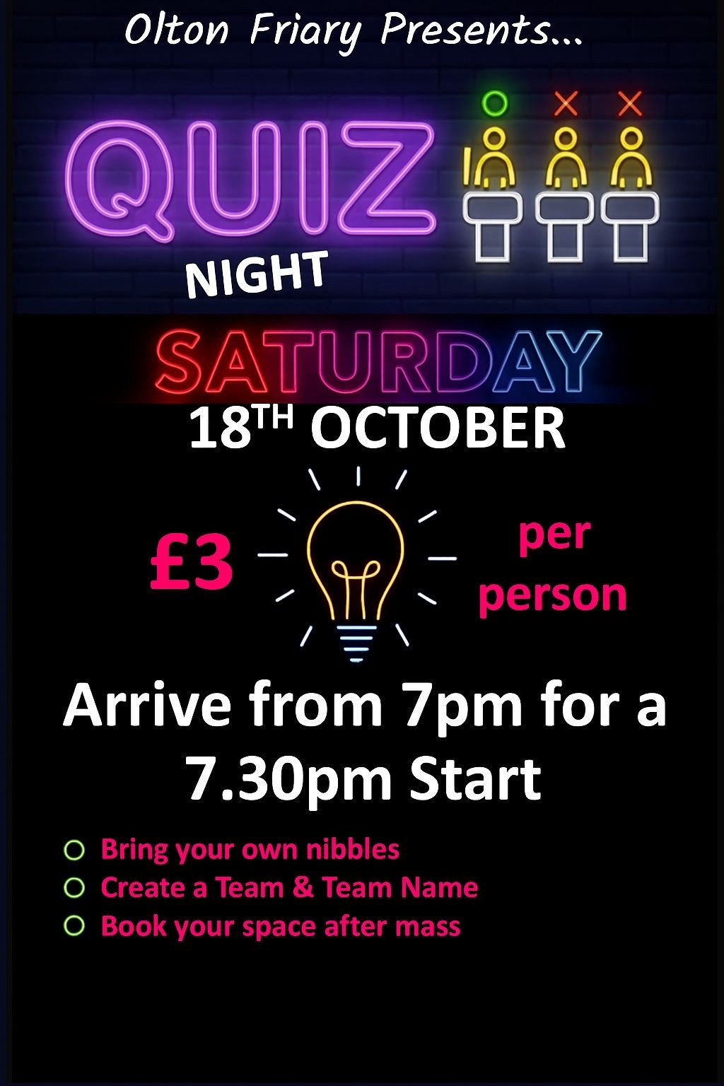 The next Quiz Night will be on Saturday 18th October, in the Parish Hall. Doors open at 7pm. Come along and join the fun!